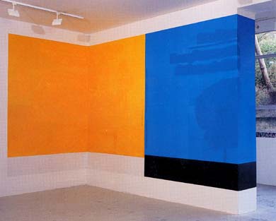 I arrived in Paris yesterday, after an eight-hour train ride from Munich that started pleasantly cool and ended swelteringly hot. I had the 6-person compartment to myself until Nancy, when it suddenly filled up with French people (and an American yuppie couple who complained about the heat in ill-disguised sotto voce all the way to Paris). I was struck by how empty and manicured the European landscape is outside the cities; the billboards, trailers, yard-junk, and garbage that line every American roadside and railbed are simply not to be seen. What's wrong with these people? Dave and Trish's apartment is beautiful, and I'm finally sitting down to jot down some notes on my Munich trip. JUNE 21 The Lenbachhaus is a sprawling 19th Century mansion that houses changing contemporary art exhibits as well as a permanent collection. Its highlights are the Blaue Reiter galleries, featuring scores of pre-abstraction Kandinskys (his best work, IMHO), and a great selection of early Richters. A temporary exhibit of Noriyuki Haraguchi's all-black paintings, sculptures, and installations was bad beyond belief, ripping off much better ideas by Panamarenko, Gunter Umberg, and Charles Ray. At the Odeonsplatz, I ogled the Felderrnhalle portico and wandered around inside the Theatinerkirch, an ornament-crazed baroque church. After bratwurst and ice cream at the Viktualienmarkt (a large open air eating place filled with a beer-drinking lunch crowd), I strolled past the Neues Rathaus (an over-the-top, Neo-Gothic commercial building) and ducked inside the Residenz (Palace) to view the "Untertwegs" ("Moving On") exhibit, featuring Stefan Eberstadt's work. Later, Stefan, Courtenay, and I had dinner at the city's bucolic beer garden. JUNE 22 After entering the Haus Der Kunst, a many-columned, faux-Athenian building constructed during the Third Reich (where the "Degenerate Art" exhibit was held), I decided I didn't need to see the retrospective of stripe painter Sean Scully--living proof that a thousand collectors CAN be wrong. At the edge of the English Garden, I watched surfers in wetsuits "shooting the curl"-- a four-foot-high standing wave resulting from the steady influx of canal-water into the Garden. Next, I headed to the Bavarian National Museum, where I viewed elaborate rococo cabinets, suits of filigreed armor, and an intricate model of Munich in the late 1800s, with all buildings and monuments painstakingly carved in wood and arrayed on a vast circular tabletop. In the evening I tagged along with Courtenay and Stefan to several gallery openings. At a satellite space run by the Munich Academy in a downtown subway tunnel, two artists had built a "bachelor pad" complete with particleboard conversation pit, wall paintings of ducks, and portable bar stocked with a brand of German whiskey popular in the 70s. At a very raw, temporary space called Sub 11 we saw three excellent videos. In "Boys Don't Cry," an all-girl rock-and-roll trio enthusiastically bangs out the Cure song for an audience consisting of two or three spastically dancing guys; incongruously, the overdubbed music sounds more like the metronomic synthpop of Trio's "Da Da Da" than the hardcore punk the girls seem to be pantomiming. The camera zooms and pans in a delightfully inept imitation of MTV circa 1981, and in case you missed the connection, the network's logo floats jerkily in the screen's upper right corner. In Wolfgang Stehle's "Beautyservice," a hairdresser-type uses an industrial grinder to remove four unsightly moles from the face of an attractive young woman: the lo-fi special effects keep this from being gory, but a whiff of sadomasochism is definitely in the air. In Stehle's "Kokon," the artist (wrapped in a sleeping bag) mimes a caterpillar that raids the icebox, disappears into a cocoon of cardboard boxes, and then transforms into a butterfly. Unfortunately for the newly-hatched creature, the transition takes place indoors, so for the last three minutes the viewer watches uncomfortably as the artist, looking more like a mental patient than an insect, bangs futilely against the window glass, trying to reach the light. After the openings, we ate at a traditional Bavarian restaurant, where I had the Dick Cheney Special: schweinbraten (an enormous slab of gravy-soaked pork), semmeknodel (a bread dumpling, also gravy-soaked), and beer. JUNE 23 In the afternoon we drove an hour south into the Bavarian Alps to visit Ettal, another fabulously ornate baroque church, and Linderhof, where the mad King Ludwig II built his castle-away-from-home. After looking at the castle (actually a large house, liberally borrowing elements from Versailles) we toured the architectural follies such as the Moroccan room, hunting lodge, and Wagnerian "grotto." In the evening, I visited the studio of Heribert Heindl, a painter who teaches at the Munich Academy, working under Gunter Forg. Heindl turns slick-surfaced, commercially printed sheets of paper (typically sections of unused billboards) into "found monochromes." Matching the background color closely but not exactly, he paints out whatever letters or images appear on the billboard, allowing the eradicated information to determine the size and duration of the strokes, which remain slightly visible on the surface as painterly "gestures." The paper is then attached directly to the wall. Below are two abutting pieces: Toyota and C.I.C., both from 1998.