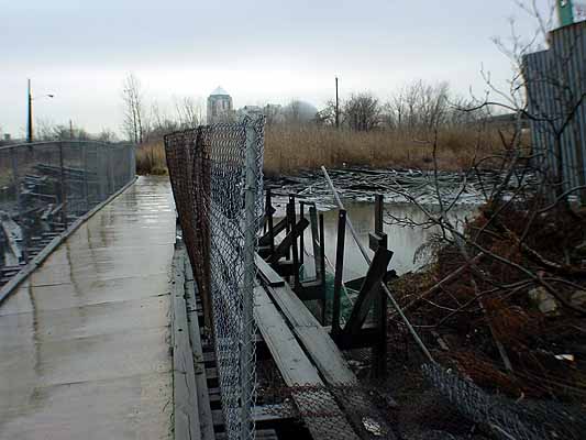 This, for me, is the high point of the tour--walking across the foetid Morris Canal on a rickety footbridge! The canal isn't really a canal anymore, just an inlet with decaying docks and a year-round ripe sewer smell. In the summer you have to walk really fast across this bridge before the mosquitoes completely drain you.
